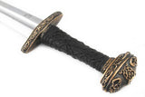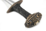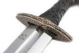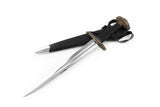 The Einar Dagger has a short 5160 spring steel blade, like all DSA products, fully battle ready – but like all daggers would also be suitable for everyday or camp duties. The bronze fittings and carved oak handle are identical to its full sized counterpart, making it an ideal piece to match the Einar sword. The scabbard has a belt loop, and it will sit comfortably on the integrated sword belt available for the Einar. This is one of our best and most popular designs – we hope you like it.