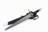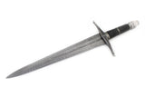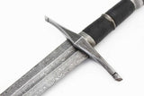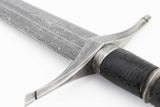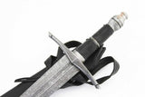 Companion dagger to the Ranger sword, the Ranger dagger is made of Damascus steel with a blend of 1095, 5160, L-6 and O1 steel, giving a stunning contrast to the folded steel layering. The handle is made of wood covered in black leather. Polished blade and pommel. The dagger comes with a scabbard and a strapping system to attach the dagger to the companion sword’s scabbard.