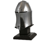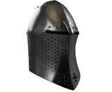 The Great Helm or Heaume was in use in the 12th, 13th and 14th Centuries and saw many improvements in form and design during that period. The flat top became rounded or conical to better deflect blows, the face and neck pieces lengthened to provide better protection and ventilation was improved by the addition of holes and design cutouts to improve airflow in the faceplate. Great Helms had no moveable parts and were generally worn over mail and/or cloth coifs. They were heavy, hot and restricted movement and vision. However, they provided vastly superior protection to predecessors helmets. The Fantasy Templar Helm is an example for a Great Helm at its peak.