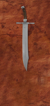 The German Gross Messer has a reputation for being a huge and imposing battle ready sword. This design (one of the 2010 Sword Buyer’s Guide Designer Contest Winners) is no exception. Gross Messers (German for “Great Knife”) look like scaled up versions of the classic “Bowie” style hunting knife, and were commonly seen during the later parts of the 15th Century. Powerful chopping weapons, they were popular among both the rich and the poor, and at this had intricate decorations on the guard and pommel.