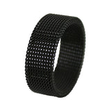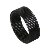 A series of intertwining black chain patterns wrapping seamlessly around this band. The ring is cast in stainless steel. The ring is lightweight and fits comfortably on the finger. The black chain mail ring pairs well with a gothic ensemble but suits many modern styles and atmospheres. We use all recycled metals. Available in sizes 7 to 10. The ring is unisex. 8.3 mm high