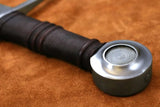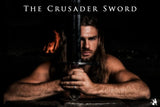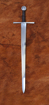 The Crusader sword, like many of its historical counterparts, is regarded as the quintessential sword of the crusading knight. Richly ceremonial due to its symbolic shape, the Cruciform swords of the Crusading period were designed with proportions of the perfection of form and harmony. Some sources speak of “divine proportions”; a complex geometry which flowed to represent the harmony of nature. The formula of these ‘proportions’ was used to create ‘golden triangles’ and ‘golden rectangles’ which were commonly applied to architectural designs. In ‘The Noble art of the Sword’, Tobia Capwell wrote that the use of the ‘divine proportions’ led to the belief and acceptance that swords could have artistic merit beyond the notion of ‘practicality’. Classically styled, the Crusader sword was designed with the ‘proportions’ in mind. The simple yet elegant sword, topped with the circular wheel pommel, was carefully fitted to a blade offering exceptional reflex, balance, and control. The sword is responsive, quick, resilient yet flexible. The sword has a sharply tapered cut and thrust blade. When in hand, the sensation, is that of an extension of one's arm. Although minimalist, the crusader sword is of stunning complexity. The Crusader sword is made from 5160 High Carbon steel. The peened pommel and mild steel fittings. The wood handle is wrapped in high quality distressed cognac brown leather and stitched at the side.